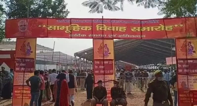 गाजियाबाद। गाजियाबाद श्रम विभाग की कन्या विवाह सहायता योजना के अंतर्गत गाजियाबाद के अलावा बुलंदशहर और हापुड़ जिलों के 2,285 हिदू-मुस्लिम और बौद्ध युवक-युवतियों के जोड़े आज कमला नेहरू पार्क में विवाह के बंधन में बंधे एक ही पंडाल में वैवाहिक कार्यक्रम में वैदिक मंत्र की गूंज के साथ ही निकाह के दौरान 'कुबूल है' की आवाज भी सुनाई दी कार्यक्रम की तैयारियां पूरी हो चुकी हैं बतौर मुख्य अतिथि सीएम योगी आदित्यनाथ ने वीडियो कांफ्रेंसिंग के माध्यम से सभी वैवाहिक जोड़ों को आशीर्वाद भी दिया समारोह में बतौर मुख्य अतिथि उत्तर प्रदेश के श्रम एवं सेवायोजन मंत्री स्वामी प्रसाद मौर्य शामिल हुए इससे पहले इस कार्यक्रम में मुख्यमंत्री योगी आदित्यनाथ का आना तय था, लेकिन वाराणसी में मां अन्नपूर्णा देवी की मूर्ति स्थापना समारोह में उनके शामिल होने से सामूहिक विवाह समारोह में उनका आना टल गया है। अब वह आनलाइन माध्यम से विवाह समारोह स्थल पर नवविवाहित जोड़ों को आशीर्वाद दिया
