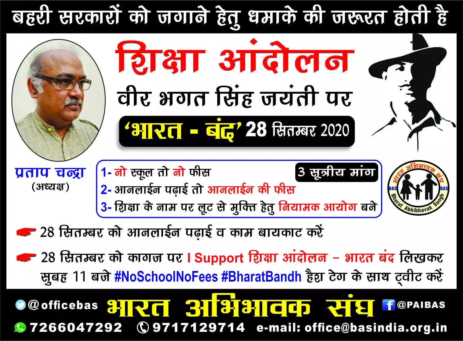 भारत अभिभावक संघ के नेतृत्व में चल रहे स्कूल फीस आन्दोलन के तहत भगत सिंह के जन्मदिन 28 सितम्बर 2020 सोमवार को "भारत-बंद" का आव्हान किया गया है जिसे सफल बनाने के लिए देश भर के 50 अभिभावक संगठनों और 10 सामाजिक संगठनों नें समर्थन दिया है. लिस्ट संलग्न है.