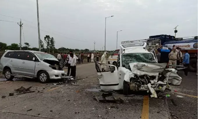 राजगढ़ ज़िले में NH-52 पर सारंगपुर के पास वैगनार और इनोवा की भीषण ज़बरदस्त टक्कर में 5 लोगों की मौत और 4 लोग घायल हो गए. बायपास के पास वैगनार कार और इनोवा गाड़ी में आमने-सामने की टक्कर हो गयी. टक्कर इतनी ज़बरदस्त थी कि वैगनार के परखच्चे उड़ गए. वैगनार गाड़ी में इंदौर का यादव परिवार सवार था जो गुना से वापस अपने घर इंदौर लौट रहा था. चारों की मौके पर ही मौत हो गयी. मृतकों के नाम अमर सिंह, उनकी पत्नी सिया दुलारी, बेटा शैलेष (25 साल) और मोहित (14 साल) हैं. दूसरी ओर, इनोवा गाड़ी में सवार पंच दसानन जूना अखाड़ा के अध्यक्ष महंत सोमेश्वर गिरी अहमदाबाद से लखनऊ जा रहे थे. दुर्घटना में उनके साथी घायल हो गए.