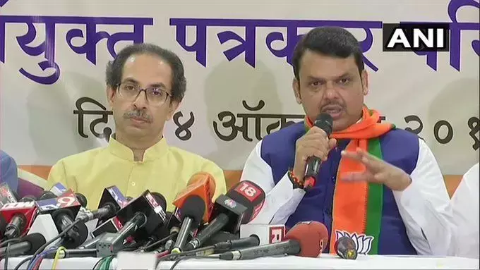 महाराष्ट्र विधानसभा चुनाव को लेकर बीजेपी और शिवसेना ने शुक्रवार को सीट शेयरिंग को लेकर साझा प्रेस कॉन्फ्रेंस की है. इस दौरान महाराष्ट्र के सीएम देवेंद्र फडणवीस और शिवसेना प्रमुख उद्धव ठाकरे ने संयुक्त रूप से शीट शेयरिंग के बारे में ऐलान किया है.