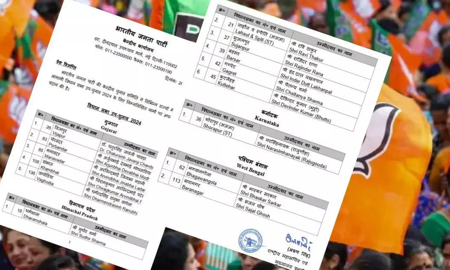 BJP Candidates List: हिमाचल की राजनीति में चल रही उठापटक का आज पटाक्षेप हो गया है। भारतीय जनता पार्टी ने हिमाचल उप चुनाव (Himachal By Elections) के लिए सभी छह बागियों को टिकट जारी कर दिया है।;