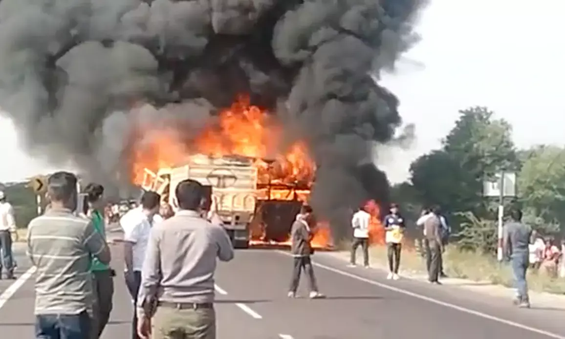 राजस्थान में बस और टैंकर की भिड़ंत में 5 लोगों के जिंदा जलने की खबर सामने आ रही है। मीडिया रिपोर्ट्स के मुताबिक बाड़मेर जिले के पचपदरा थानान्तर्गत जोधपुर नेशनल हाईवे पर भांडियावास गांव में बुधवार को बस और ट्रक की भिड़ंत हो गई। इससे बस और ट्रेलर में भीषण आग लग गई। इसमें 5 लोगों के जिंदा जलने की आशंका है। सूचना मिलने पर पुलिस और फायर बिग्रेड की टीम मौके पर पहुंची है। आग पर काबू पाने का प्रयास किया जा रहा है। बस में सवारियां होने की बात सामने आ रही है।