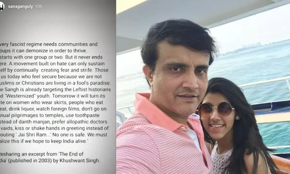 बीसीसीआई अध्यक्ष सौरव गांगुली की बेटी सना (18) ने नागरिकता संशोधन कानून (सीसीए) के विरोध वाली एक पोस्ट इंस्टाग्राम पर शेयर की थी। उन्होंने इसे हटा लिया था, लेकिन उसका स्क्रीनशॉट सोशल मीडिया पर वायरल हो रहा है। इस पर सौरव ने बुधवार को कहा, ''कृपया सना को इन सभी मामलों से दूर रखें। यह पोस्ट सच नहीं है। राजनीति को समझने के लिए अभी वह बहुत छोटी है।''