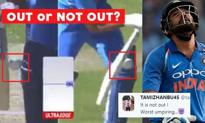 वहीं दूसरी तरफ सोशल मीडिया पर भारतीय फैंस थर्ड अंपायर के खिलाफ जमकर गुस्सा निकाल रहे हैं। बता दें कि रोहित ने 23 गेंद में 18 रन बना लिए थे जिसके बाद वह आउट हुए। रोहित द्वारा ट्विटर पेज पर आउट होने की करीब से फोटो पोस्ट की जिसमें लग रहा था कि उनके बल्ले और गेंद के बीच काफी जगह दी थी।