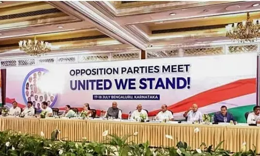 बेंगलुरु बैठक में कांग्रेस के राष्ट्रीय अध्यक्ष मल्लिकार्जुन खड़गे ने नवगठित 26 पार्टी गठबंधन इंडिया के नाम की घोषणा की।