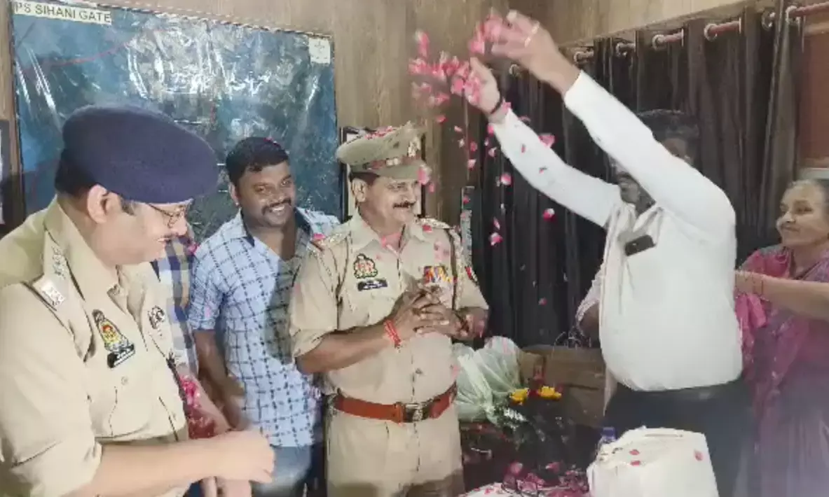 लगभग ₹800000 के माल की चोरी हुई थी उसमें से 80% माल बरामद होने खुश होकर परिवार ने पुलिस के ऊपर फूलों की वर्षा की;