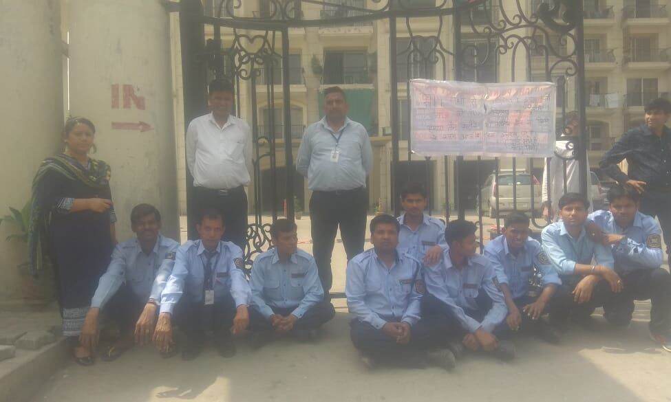 गाजियाबाद के इंदिरापुरम के शिप्रा न्यू सोसाइटी में सिक्योरिटी गार्ड सैलेरी न मिलने कि बजह से धरने पर बैठे हैं.;