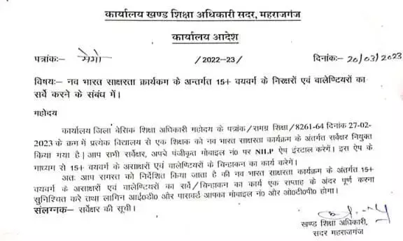 आदेश में कहा गया है कार्यक्रम जिला बेसिक शिक्षा अधिकारी के पत्रांक /समग्र शिक्षा 8261-64दिनांक 27-02-2023 के क्रम में प्रत्येक विद्यालय से एक शिक्षक को नव भारत साक्षरता कार्यक्रम के अंतर्गत सर्वेयर नियुक्त किया गया है। आप सभी सर्वेयर अपने पंजीकृत मोबाइल नंबर परNILP एप्प इंस्टाल करेंगे।