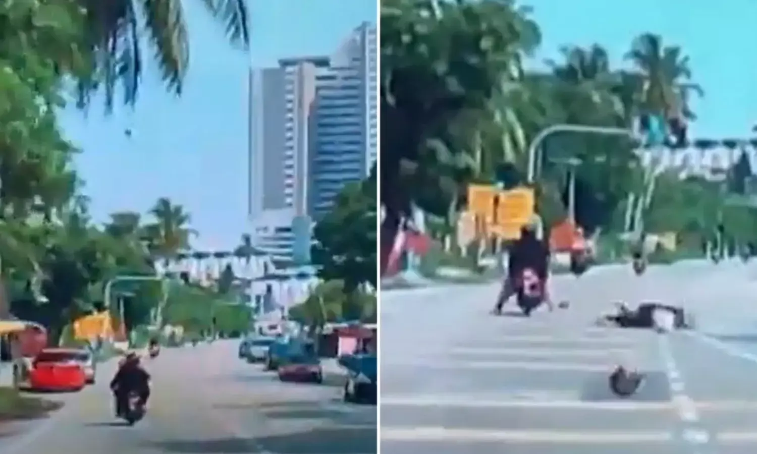 स्थानीय मीडिया की रिपोर्ट के अनुसार यह स्कूटर तेलुक कुंबर से जॉर्ज टाउन जा रहा था. वीडियो में दिखता है कि स्कूटी की पिछली सीट पर बैठी महिला के सिर पर बास्केटबॉल के आकार का नारियल गिरता है. इसके असर से महिला का हेलमेट खुल जाता है और वो लगभग बेहोश होकर सड़क पर गिर जाती है.