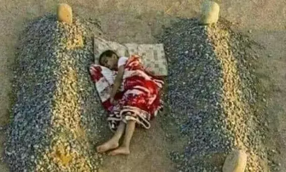 दो कब्रों के बीच सोए एक बच्चे की तस्वीर एक बार फिर सोशल मीडिया पर वायरल हो रही है. दावा किया जा रहा है कि तस्वीर सीरिया की है, जहां यह बच्चा अपने माता-पिता की कब्रों के बीच सोया हुआ है.