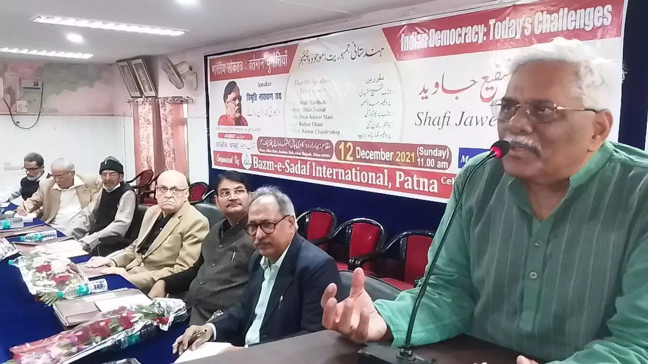बज़्मे सदफ़ इंटरनेशनल, पटना के निदेशक प्रो. सफ़दर इमाम क़ादरी ने सत्र आरम्भ करते हुए उर्दू के ख्याति प्राप्त कथाकार शफ़ी जावेद के योगदान की चर्चा की और उन्हें जनतांत्रिक मूल्यों की रक्षा हेतु समर्पित लेखक स्वीकार किया । उन्होंने कहा कि इसी कारण उनकी पुण्य तिथि पर इस विषय पर श्री विभूति नारायण राय का व्याख्यान रखा गया । व्याख्यान की अध्यक्षता करते हुए मूर्धन्य कवि आलोक धन्वा ने उर्दू हिंदी भाषाओं और हिन्दू मुस्लिम साझा समाज को पूर्ण रूपेण संरक्षित किये बिना जनतंत्र को पचा पाना मुश्किल क़रार दिया। उन्होंने युवाओं का आह्वान किया कि भारतीय समाज में लोकतांत्रिक मूल्यों की स्थापना के लिए वे संघर्ष हेतु सामने आएँ।