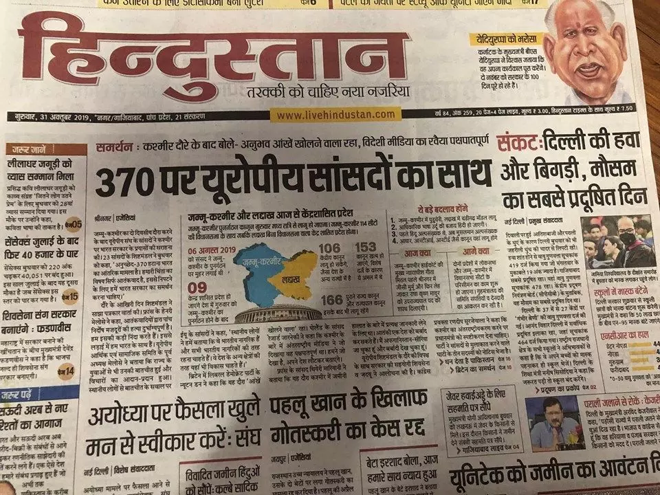हिन्दुस्तान अख़बार ने जर्मनी से यूरोपियन संघ की संसद में सांसद निकोलस फेस्ट का बयान ही नहीं छापा है। निकोलस फेस्ट ने कहा है कि अगर यूरोपियन संघ के सांसदों को कश्मीर दौरा करने दिया गया है तो विपक्ष के भारतीय नेताओं को भी जाने देना चाहिए था। सरकार को इस तरह का असंतुलन नहीं पैदा करना चाहिए। हिन्दी के पाठकों के बीच यह सूचना नहीं जाती है। निकोलस ने किसी एक अख़बार से नहीं बात की थी बल्कि न्यूज़ एजेंसी एएनआई को बयान दिया था जो सबके लिए उपलब्ध था। कई चैनलों पर चला भी था।