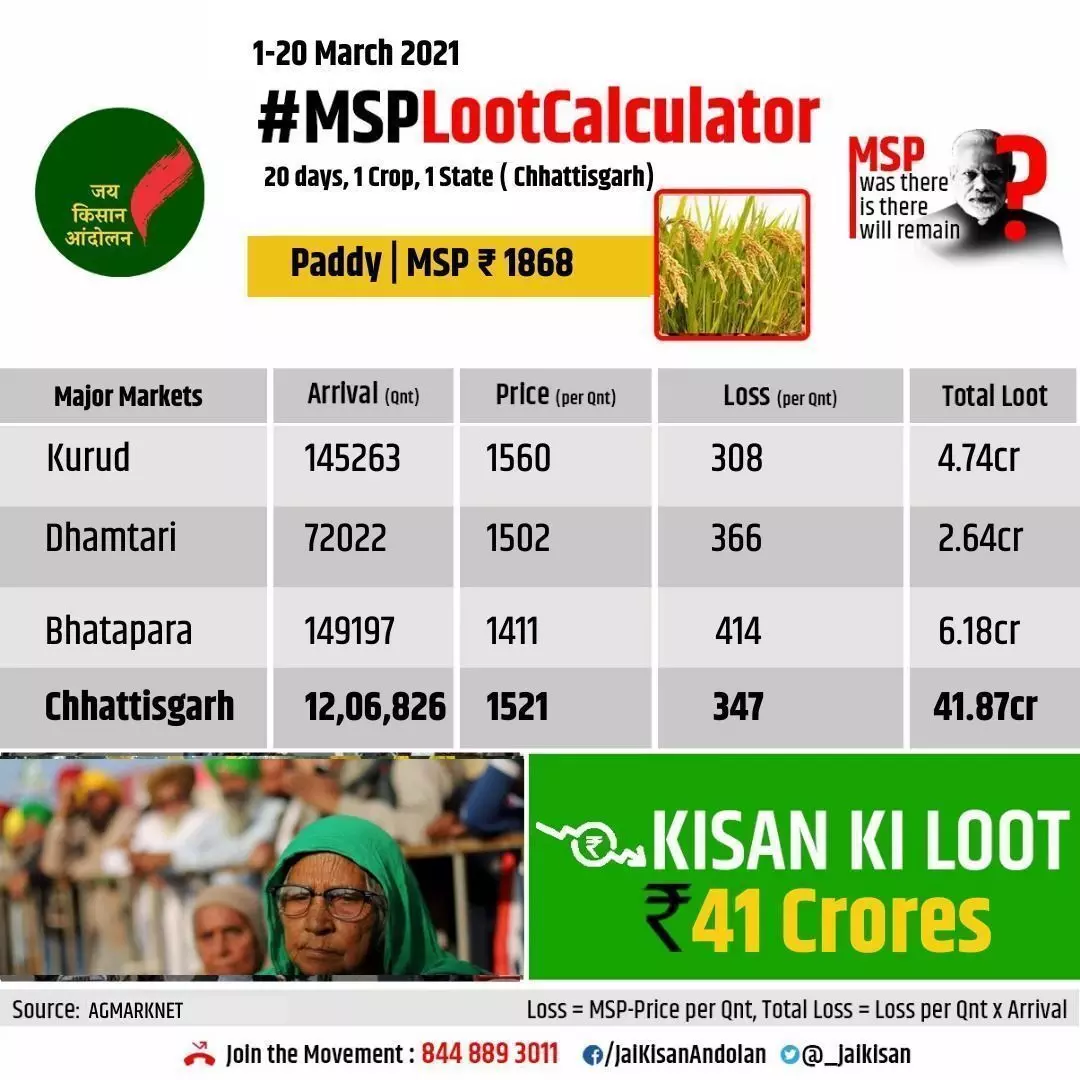 किसान नेता योगेंद्र यादव ने कहा कि ने धान का न्यूनतम समर्थन मूल्य यानी एमएसपी ₹1868 निर्धारित किया था। लेकिन छत्तीसगढ़ की सभी मंडियों में किसान को औसतन ₹ 1521 ही मिल पाए। यानी छत्तीसगढ़ के किसान को प्रति क्विंटल सरकार द्वारा निर्धारित न्यूनतम से भी कम बेचने के कारण ₹347 का घाटा सहना पड़ा।