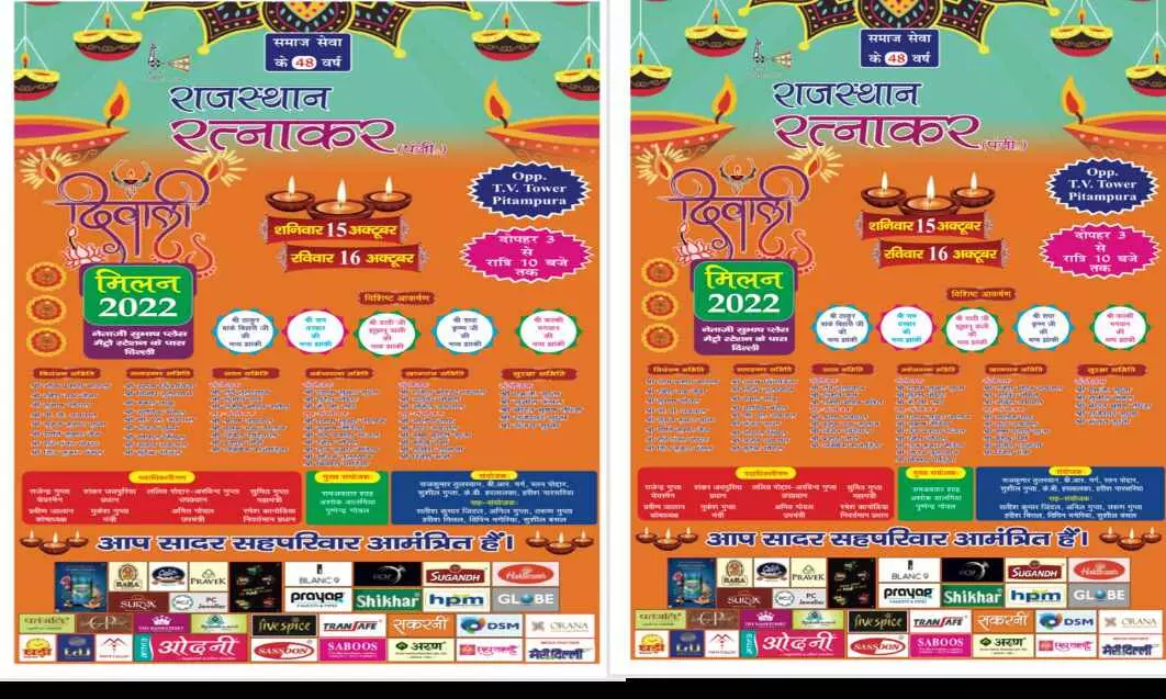 इसी कड़ी के तहत राजस्थान रत्नाकर ने दीपावली के पर्व पर दिवाली मिलन समारोह का आयोजन किया है। इसमें आप सबसे अनुरोध है कि शनिवार 15 अक्टूबर और रविवार 16 अक्टूबर 3 से 10 बजे तक टीवी टावर पीतमपुरा के सामने आप सादर आमंत्रित है।