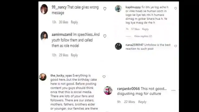 दूसरे यूजर ने लिखा, 'मैं आपका फैन हूं, लेकिन हमें निराश कर दिया। कुछ चीजें निजी रखने की जरूरत होती है।' एक यूजर और यूजर ने कॉमेंट करते लिखा, 'हैप्पी बर्थडे लेकिन केक ठीक नहीं है। यह अश्लील दिख रहा है।'