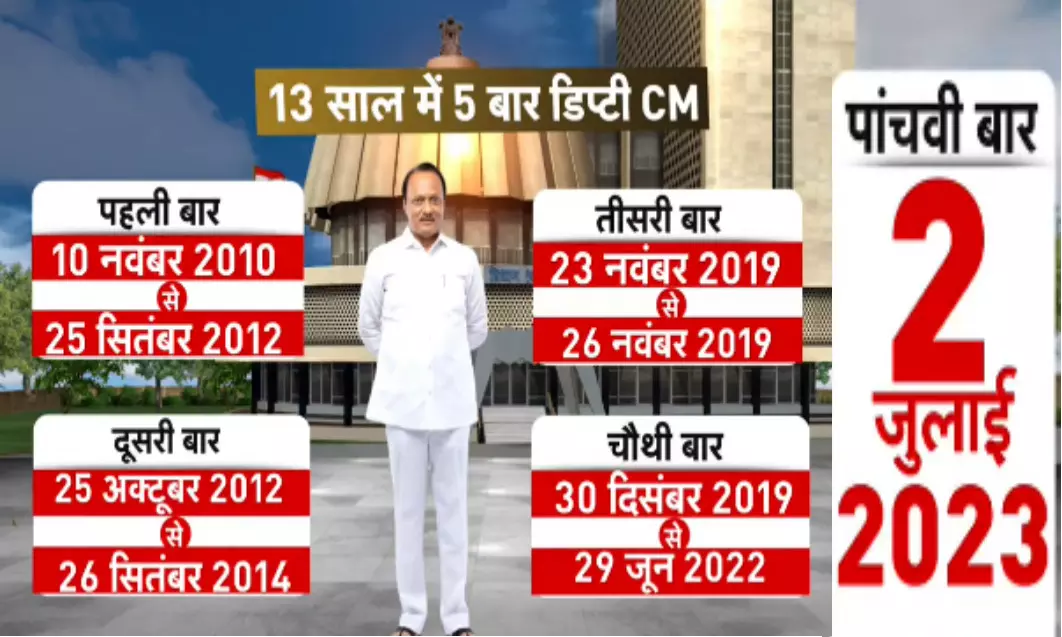 अजीत पवार अब तक पाँच बार डिप्टी सीएम की शपथ ले चुके है लेकिन अब तक कोई कार्यकाल पूरा नहीं हुआ है। इस बार उन्होंने फिर आनन फानन में उन्होंने डिप्टी सीएम की शपथ ले ली है, उनके साथ 9 लोगों से शपथ गृहण की है।