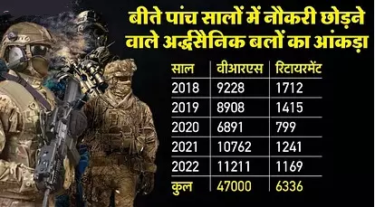 आंकड़ों के मुताबिक, सीमा सुरक्षा बल (BSF) के 23,553 जवानों ने नौकरी छोड़ी, जिसमें 21,692 ने रिटायरमेंट लिया और 1861 ने नौकरी से इस्तीफा दे दिया था। वहीं, केंद्रीय रिजर्व पुलिस फोर्स (CRPF) के 13,640 जवानों ने नौकरी छोड़ दी। जिसमें 13,027 में अपनी मर्जी से रिटायरमेंट लिया और 613 ने इस्तीफा दे दिया। असम राइफल्स से 5,393 ने सर्विस छोड़ दी। 5,313 ने रिटायरमेंट लिया और 80 जवानों ने इस्तीफा दे दिया।