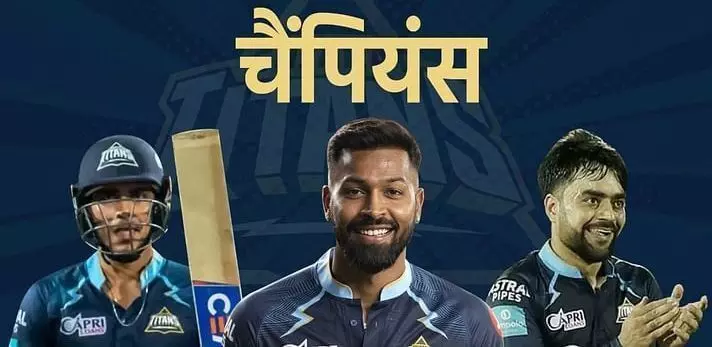 इंडियन प्रीमियर लीग को 6 साल बाद नया चैंपियन मिल गया है. आईपीएल 2022 में अपना डेब्यू कर रही गुजरात टाइटंस (Gujarat Titans) विश्व की सबसे मशहूर लीग की सबसे नई चैंपियन बन गई है. नई टीम और नए कप्तान हार्दिक पंड्या (Hardik Pandya) की जुगलबंदी ने आईपीएल 2022 का रोमांचक अंत कर दिया. अहमदाबाद में रविवार 29 मई को खेले गए फाइनल में गुजरात ने राजस्थान रॉयल्स को 7 विकेट से हराकर आईपीएल 2022 का खिताब जीत लिया. इसके साथ ही गुजरात आईपीएल का खिताब जीतने वाली सातवीं टीम बन गई. इतना ही नहीं, गुजरात ने राजस्थान के खिलाफ उसके ही कीर्तिमान की बराबरी कर ली. 2008 में पहले ही सीजन का खिताब जीतने वाली राजस्थान के बाद गुजरात पहली टीम बनी, जिसने डेब्यू सीजन में ही खिताब जीत लिया.