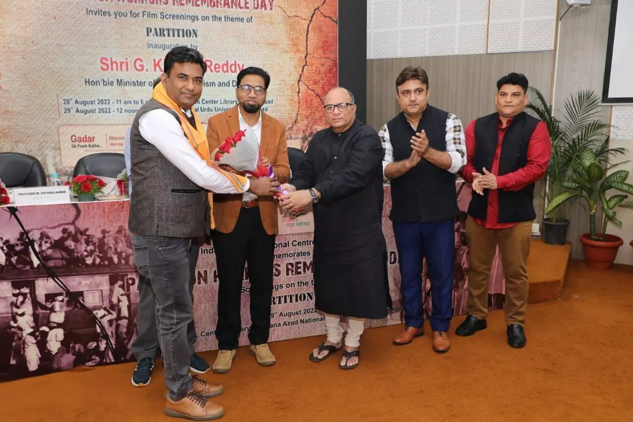 हैदराबाद, 28 अगस्त : विभाजन विभीषिका स्मृति दिवस के आयोजनों की कड़ी में केंद्रीय संस्कृति मंत्रालय और इंदिरा गांधी राष्ट्रीय कला केंद्र द्वारा आयोजित दो दिवसीय फिल्म स्क्रीनिंग का उद्घाटन हैदराबाद स्थित मौलाना आजाद उर्दू यूनिवर्सिटी के ऑडिटोरियम में प्रसिद्ध फिल्म निर्माता-निर्देशक चंद्रप्रकाश द्विवेदी ने रविवार, 28 अगस्त को सुबह 11 बजे किया। इस अवसर पर केंद्रीय संस्कृति मंत्रालय और इंदिरा गांधी राष्ट्रीय कला केंद्र द्वारा बंटवारे के विषय पर आधारित डॉक्यूमेंट्री और शॉर्ट फिल्मों की प्रतियोगिता के विजेताओं को भी पुरस्कार प्रदान किए गए।