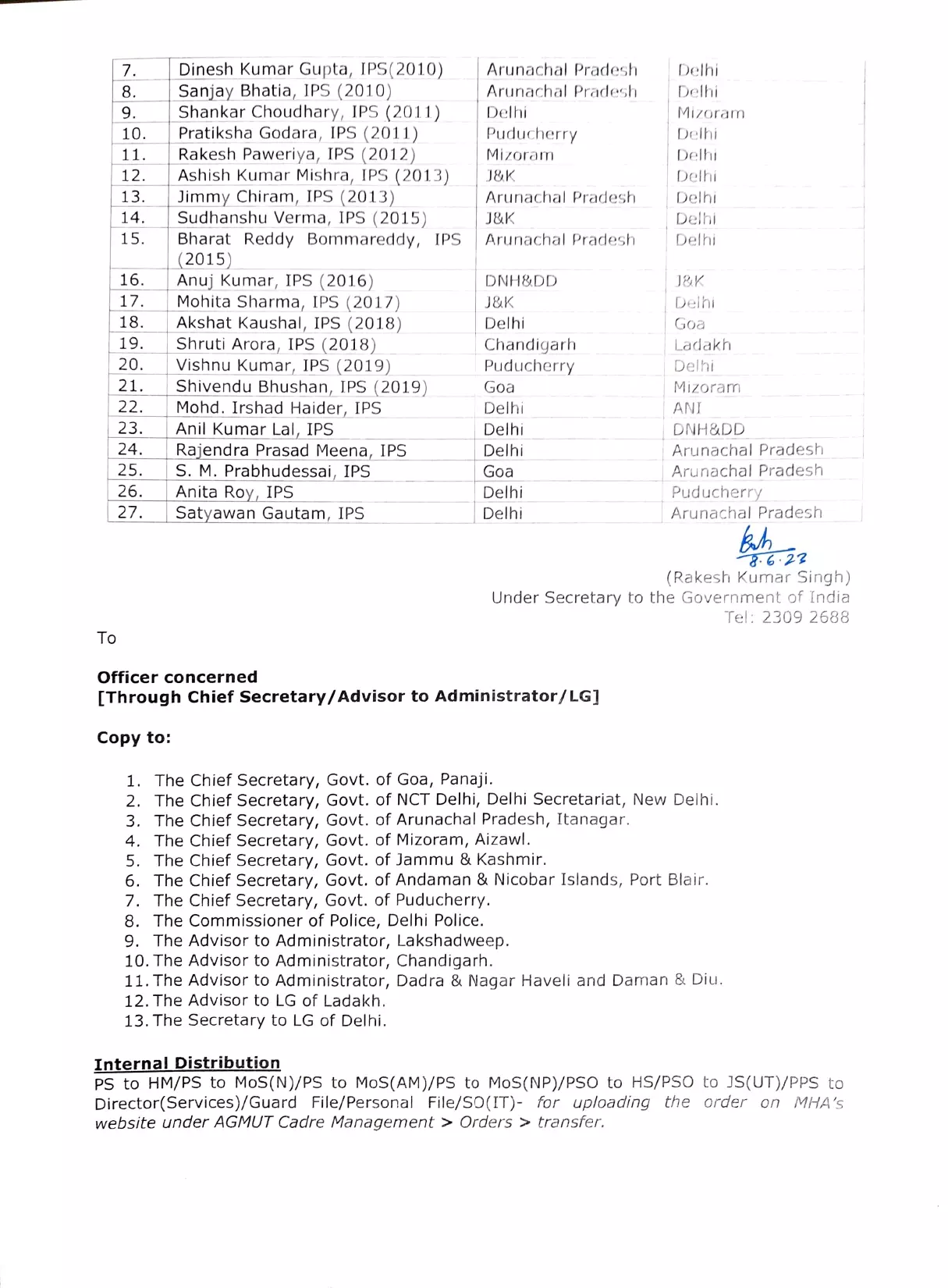 एजीएमयूटी कैडर के 32 आईएएस और 27 आईपीएस अधिकारियों का विभिन्न स्थानों पर तबादला हुआ है।