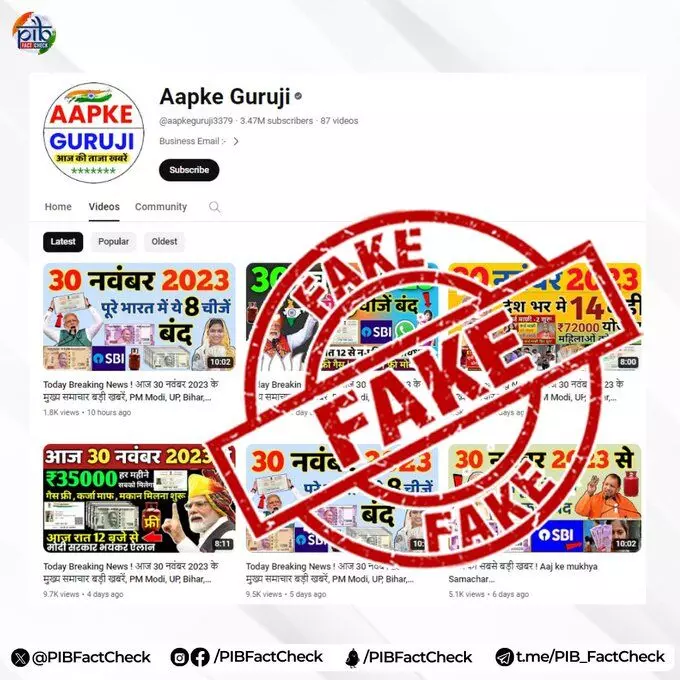 A #YouTube channel named 𝐀𝐚𝐩𝐤𝐞 𝐆𝐮𝐫𝐮𝐣𝐢 with more than 34.7 lakh subscribers and more than 𝟐𝟐 𝐜𝐫𝐨𝐫𝐞 views is regularly posting videos with fake information on the schemes being run by the Government of India