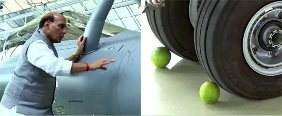 राजनाथ सिंह ने पहले राफेल विमान की शस्त्र के रूप में ओम लिखकर पूजा की. इतना ही नहीं, राफेल की टेस्टिंग उड़ान से पहले उसके पहियों के नीचे दो नींबू भी रखे गए, जो कि धार्मिक रीति-रिवाजों का हिस्सा माना जाता है.