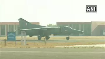 #WATCH Indian Air Force's MiG-27 which retires today receives water salute at Air Force Station Jodhpur pic.twitter.com/qo1uX4o969