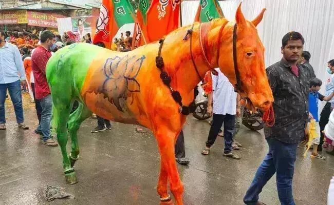 जन आशीर्वाद यात्रा के दौरान 'घोड़े' को भाजपा झंडे के रंग में रंगा,पशु क्रूरता का मामला दर्ज