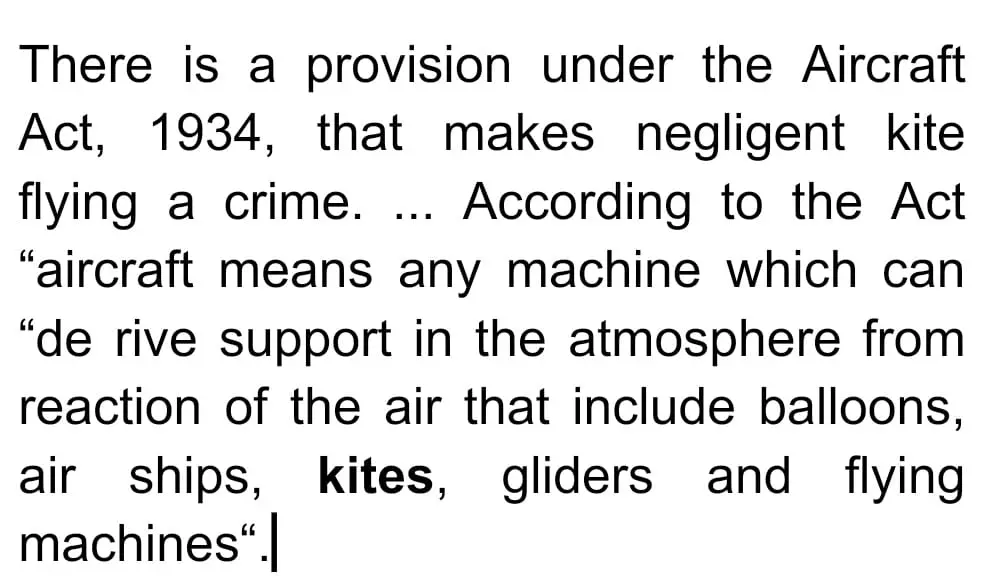 एयरक्राफ्ट एक्ट 1934 के मुताबिक आसमान में उड़ाई जाने वाली वस्तु जैसे पतंग और बैलून आदि को उड़ाने, निर्माण तथा मरम्मत करने के लिए लाइसेंस लेना अनिवार्य है । ऐसा न करने पर 10 लाख रूपए जुर्माने और दो साल के कारावास अथवा दोनों का प्रावधान है ।