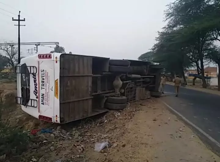 बता दें घटना यूपी के हाथरस जिले के थाना हाथरस जंक्शन क्षेत्र के बरेली मथुरा राजमार्ग पर मेंडू कस्बे के भैरव मंदिर के निकट श्रद्धालुओं से भरी एक प्राइवेट बस नंबर यूपी25 AT 2703 असंतुलित होकर सड़क किनारे पलट गयी। दुर्धटना में बस में सवार एक दर्जन श्रद्धालु चोटिल हो गए। बस का ड्राइवर दुर्घटना के बाद फरार हो गया।