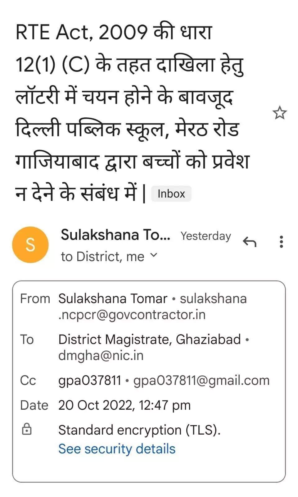 गाजियाबाद पेरेंट्स एसोसिएशन द्वारा दिल्ली पब्लिक स्कूल , मेरठ रोड द्वारा निःशुल्क एवम अनिवार्य बाल शिक्षा अधिकार ( आरटीई ) के अंतर्गत चयनित बच्चों का दाखिला नही लिये जाने की शिकायत बच्चों के अधिकारों की रक्षा करने वाली राष्ट्रीय बाल अधिकार सरक्षंण आयोग , नई दिल्ली से की थी।