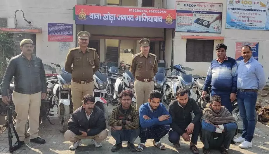 गाजियाबाद : देश की राजधानी दिल्ली से सटे जिला गाजियाबाद में पुलिस ने एक बड़ी कामयाबी हासिल की है. गाजियाबाद के थाना खोड़ा पुलिस ने पांच अन्तर प्रान्तीय वाहन चोरों को गिरफ्तार करने में बड़ी सफलता प्राप्त की है. गिरफ्तार अभियुक्तों से 14 चोरी की मोटर साइकिल व 1 स्कूटी मय 3 अवैध चाकू नाजायज व 1 कम्पयूटर के उपकरण मय फर्जी कागजात बरामद हुए हैं.