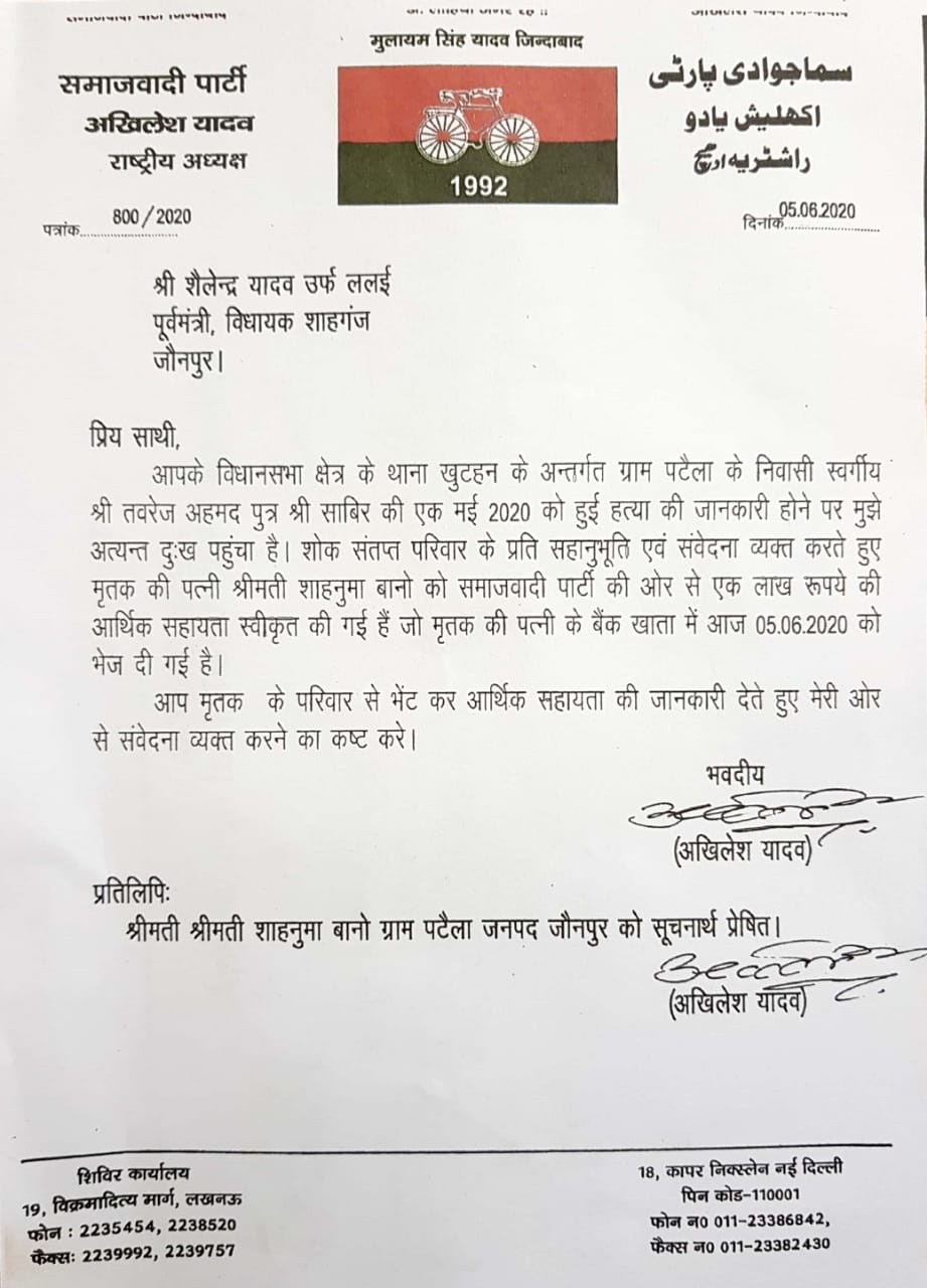 पूर्व मंत्री शाहगंज विधायक शैलेंद्र यादव ललई को उन्होंने पत्र भेजा। इसमें उन्होंने लिखा था कि "प्रिय साथी, आपके विधानसभा क्षेत्र के खुटहन थाना के अंतर्गत पटैला के निवासी स्व श्री तबरेज अहमद पुत्र साबिर की एक मई 2020 को हुई हत्या की जानकारी पर मुझे अत्यंत दुःख पहुँचा है. परिवार के प्रति संवेदनाए व्यक्त करतें हुए मृतक के पत्नी शाहनुमा बानो को समाजवादी पार्टी की ओर से एक लाख रुपये आर्थिक सहायता दी गई। जो मृतक की पत्नी के खातें में शुक्रवार को भेज दी गई है। आप मृतक के परिवार के परिवार से भेंट कर आर्थिक सहायता की जानकारी देतें हुए संवेदना व्यक्त करने का कष्ट करें।
