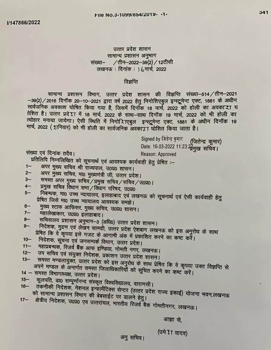 उत्तर प्रदेश सरकार ने 18 मार्च को होली के दिन अवकाश के बाद 19 मार्च शनिवार को भी सरकारी अवकाश घोषित किया है। उत्तर प्रदेश सरकार के सामान्य प्रशासन के प्रमुख सचिव जितेंद्र कुमार की तरफ से जारी किए गए निर्देश के लिखा गया है कि होली 18 मार्च को है। इसके अतिरिक्त 19 मार्च को भी होली का सार्वजनिक अवकाश घोषित किया गया है। 19 मार्च को शनिवार होने की वजह से लगातार तीन दिन सरकारी अवकाश रहेगा। सरकार की तरफ से जारी किए गए 19 मार्च के अवकाश के दिन होली मनाए जाने का निर्देश दिया गया है।