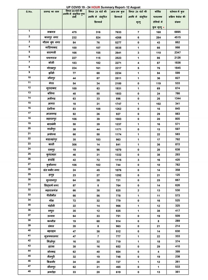 UP Corona live updated : यूपी के सभी जिलों की अलग अलग कोरोना मरीजों की रिपोर्ट