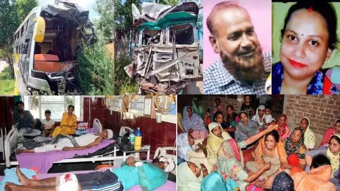 यूपी के शाहजहांपुर से सवारियां लेकर दिल्ली जा रही स्लीपर बस शनिवार देर रात सामने से आ रहे लंबी बॉडी के ट्रक से टकरा गई। हादसे में निजी बस के चालक और एक हेल्पर समेत छह लोगों की मौत हो गई, जबकि 47 लोग घायल हुए हैं। हादसे के बाद ट्रक चालक मौके से भाग हो गया। मौके पर पहुंची पुलिस ने घायलों को जिला अस्पताल पहुंचवाया। शव पोस्टमार्टम के लिए भेजे। पुलिस ने तहरीर के आधार पर अज्ञात ट्रक चालक के खिलाफ रिपोर्ट दर्ज कर ली है। हादसा सिविल लाइंस थाना क्षेत्र में शनिवार देर रात 12 बजे के आसपास हुआ। बस में सवार मुसाफिरों के मुताबिक शाहजहांपुर से दिल्ली जा रही स्लीपर बस बाईपास से गुजरते समय एक वाहन को ओवरटेक कर रही थी। ओवरटेकिंग के दौरान बस सामने से आ रहे ट्रक से टकरा गई। बस में चालक व दो हेल्पर के अतिरिक्त करीब 50 लोग सवार थे।