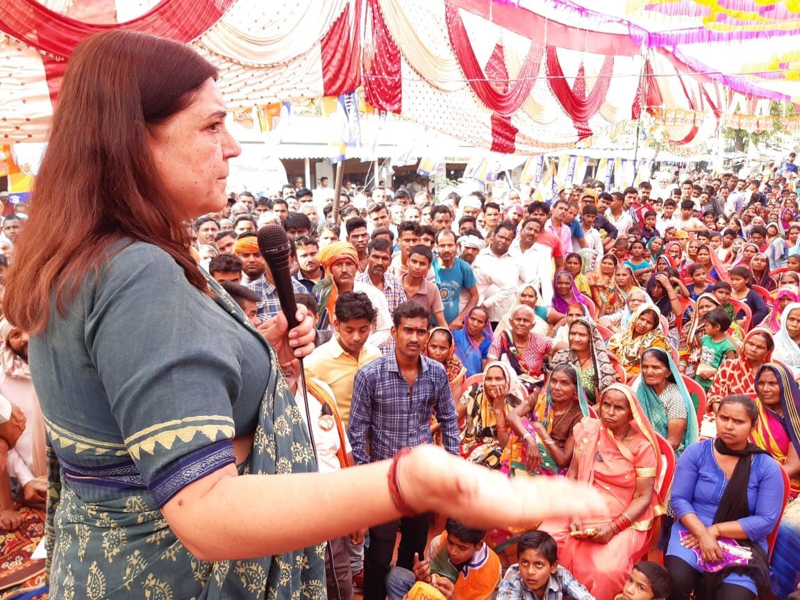 वही मेनका गाँधी ने यह भी कहा कि क्षेत्र में मेरे पास कई कोटेदार आए, उन्होंने बताया कि बंदूक की नोक पर हमसे लाखों की वसूली हुई। जो राशन गरीबों को बंटने आया था। जबरन उठवा ले गए। अगर बंदूकधारी को आप लोग चुनेंगे तो यही होगा। क्योंकि वह लेने वाला है। जबकि मैं यहां की जनता को देने आई हूं। फैसला आपको करना है। गुंडे-बदमाशों को यहां से भगाना व जनता का भला एवं जिले का विकास ही हमारा मकसद है। वही मेनका गांधी ने जनसभा को सम्बोधित करते हुए गठबंधन प्रत्यासी पर जमकर किया प्रहार कहा रैली में आये नौजवान नही देख रहे अपना भविष्य, मेनका गाँधी आएगी तो चीनी मिल को करेगी ठीक। इनके अंदर नही है कोई काबिलियत,बंदूक की नोक पर वसूलेंगे गन्ना किसानों से दो-दो सौ.रुपये,आप लोग उन लोगो को समझाने की करे कोशिश। यहां कोई गठबंधन नही है यहाँ एक तरफ मेनका गांधी है तो दूसरी तरफ वह बंदूक धारी है जो है एक क्रिमनल। जो बंदूक की नोंक पर गोदाम का सारा अनाज लूट लिया।