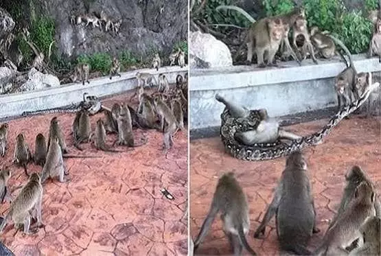अगर भारी-भरकम अजगर बंदर जैसे तेज जानवर को अपने चंगुल में पकड़ ले तो हर किसी को आश्चर्य होगा. और यदि अजगर उस बंदर को बेरहमी से मार दे तो यह बड़ा दुर्भाग्य होगा. एक ऐसा ही वाकया बड़ी संख्या में मौजूद बंदरों के सामने हुआ है.